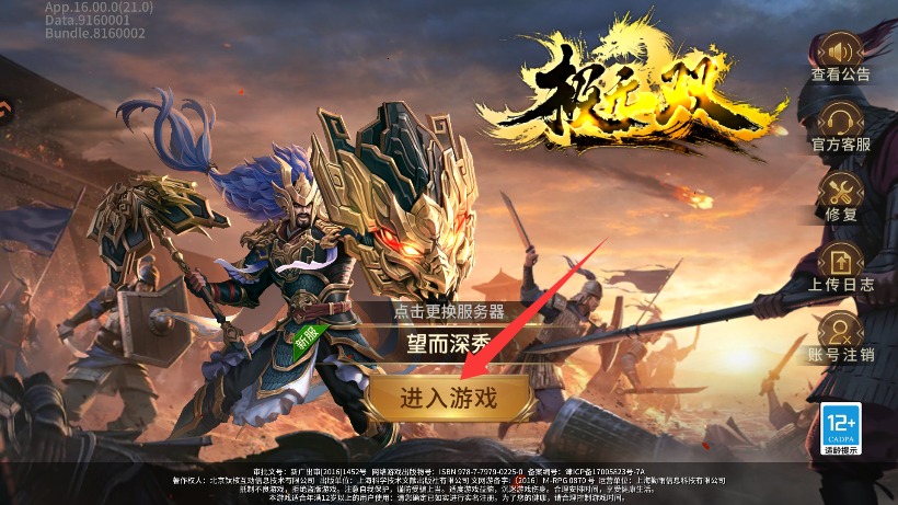 1、启动游戏后选择合适的服务器点击进入,即可开启这场热血的三国战场对决。