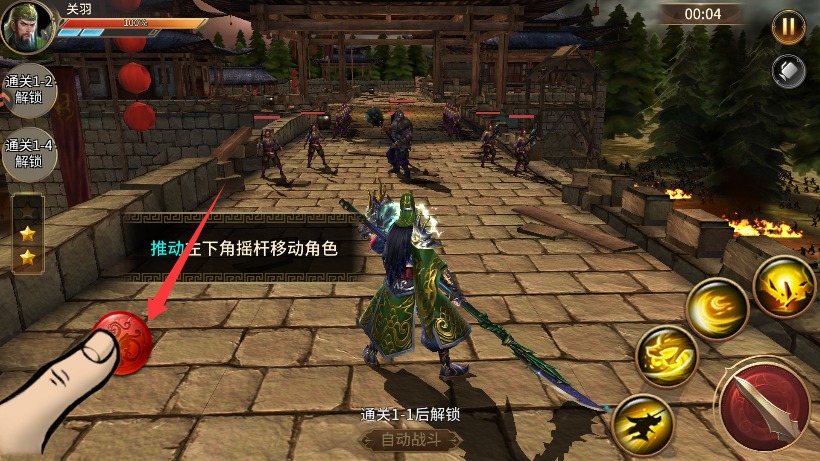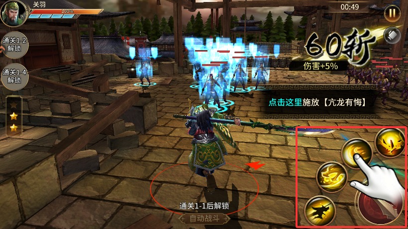 4、点击普通技能旁边的四个技能按键,释放各具特色的招式应对不同战况。