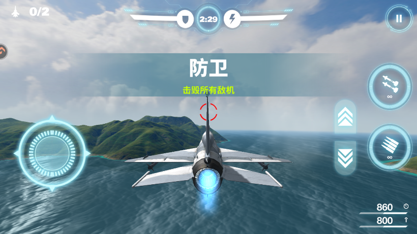 操作方面,玩家可自由配置重力感应和虚拟摇杆操作。重力感应下只需倾斜设备即可控制战机360度立体飞行。适合摇杆的玩家切换到虚拟摇杆操作方式,大拇指滑动屏幕也可以灵敏控制战机飞行。通过手指划动屏幕的方式控制战机横滚,眼镜蛇机动,后空翻等特技飞行动作,在指尖完成一系列飞行操控。战斗的流畅性极高,再结合3d全景战斗视角,充分让玩家享受最纯粹最真实的空战乐趣。