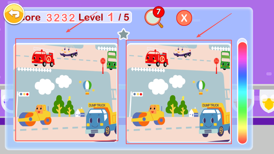 1、选择关卡进入游戏界面,观察两张图片的细节差异,可以从左上角开始系统性地寻找,培养孩子有条理的观察方法。