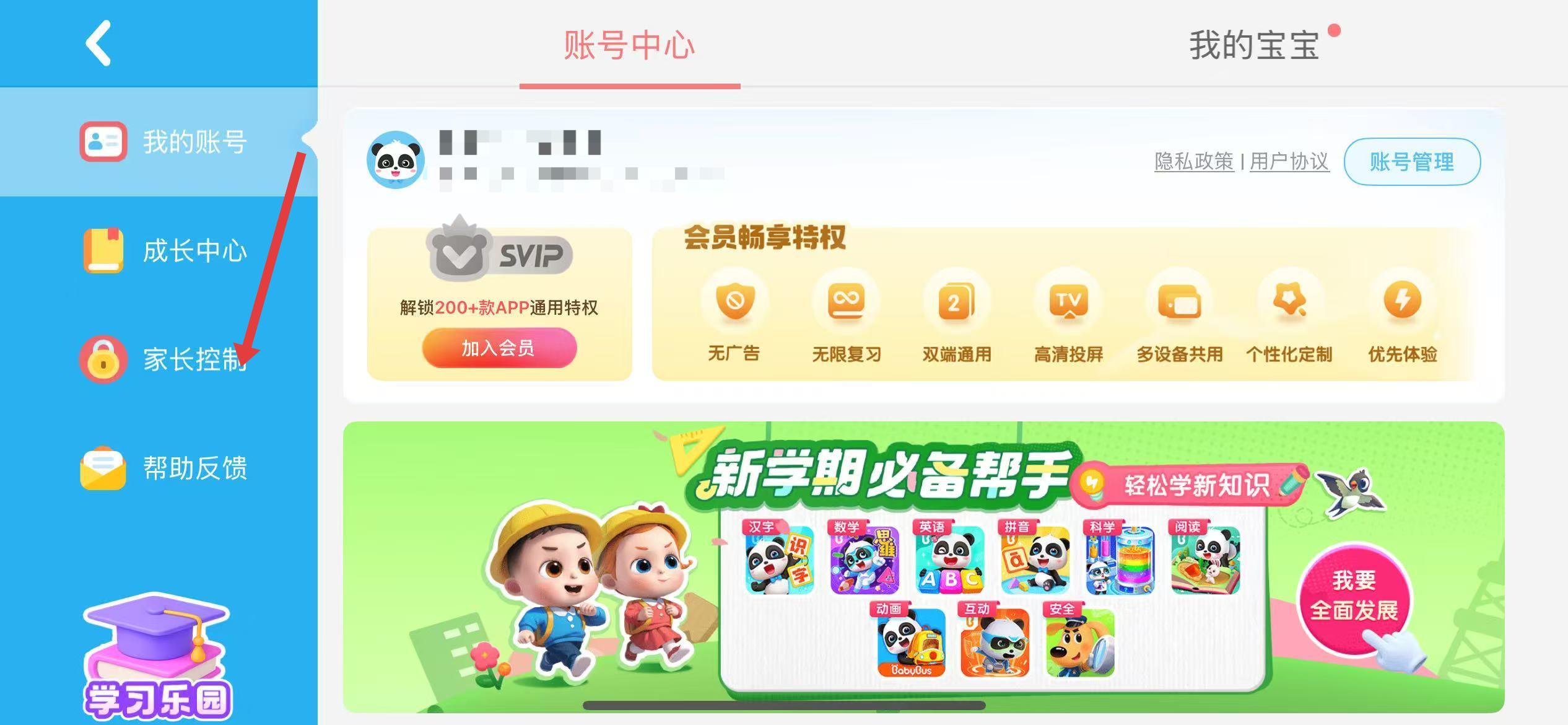 1、点击主界面右上角家长中心图标。
