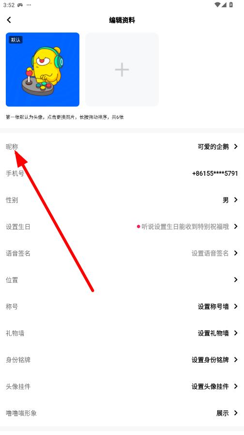 3、在编辑资料界面中,点击昵称选项,进入修改昵称页面。