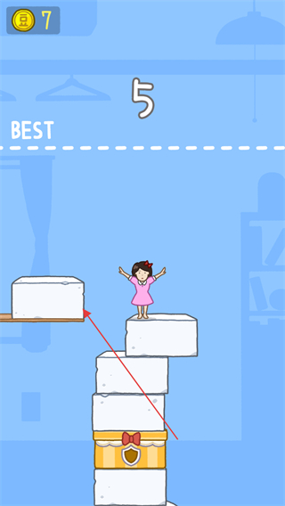 2、持续跳跃,层数升至5,触发带装饰的豆腐,维持平衡提升堆叠高度。