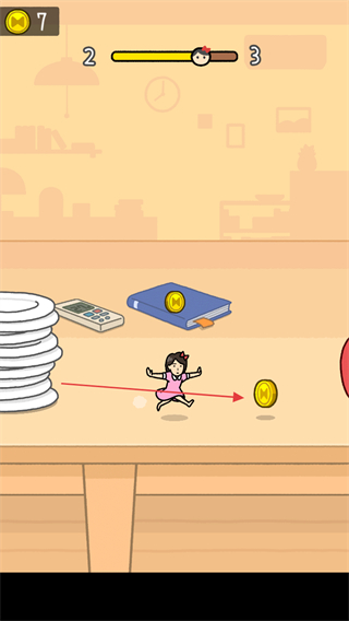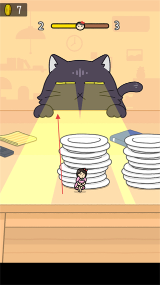 1、操控小人躲避黑猫,收集桌上金币,同时观察上方进度条,避免被黑猫发现。