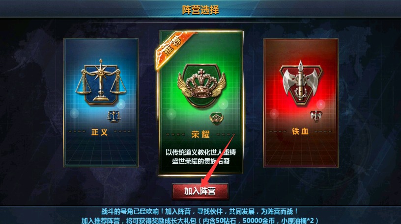 1、进入游戏后选择正义、荣耀或铁血阵营加入,这将决定你的初始舰队配置与发展路线。