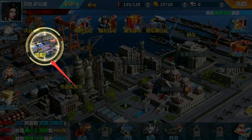 3、进入主界面点击造船厂功能区域进入,在此处可以设计与建造各类新型战舰舰船。