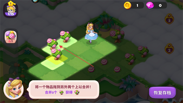 1、根据新任务要求创造1个棒棒糖,将1个棒棒糖拖到另外2个相同棒棒糖的位置,触发合并。