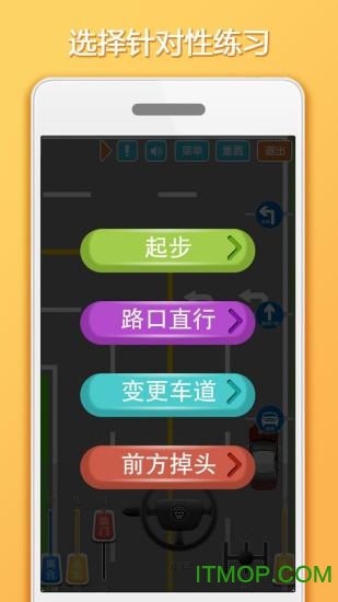 包括起步、直线行驶、路口左转、路口右转、前方掉头、超越前方车辆、靠边停车、通过公共汽车站等等。应用将考试项目拆分为86个细分动作,每个动作都有3D演示和文字说明。独创的情景训练模式可模拟雨天、夜间等特殊驾驶环境。新增的跟车训练功能,能培养学员保持安全车距的驾驶习惯。所有训练场景都基于真实道路数据建模,包含常见的突发情况应对练习。