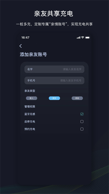 3. 支持添加家人或朋友的账号,只需输入姓名和手机号即可完成授权,方便多人共享充电资源,提升使用效率。