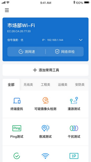 3.无线类小工具:集成了网络体检、实时测速、终端查找、摄像头检测、Wi-Fi热点查看、漫游测试等功能,全面覆盖无线网络检测需求。