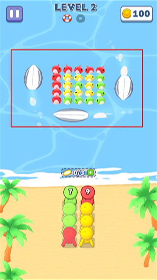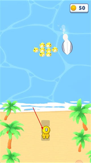 3、进入关卡2后,操控沙滩上的不同颜色角色,分别向水中对应颜色的角色群体移动并合并。