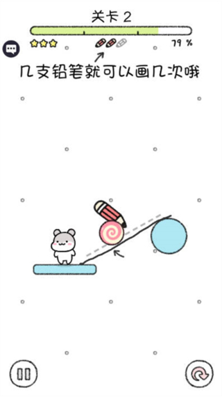 2、用铅笔绘制曲线连接仓鼠与蓝色圆球,消耗铅笔次数,推进关卡进度。