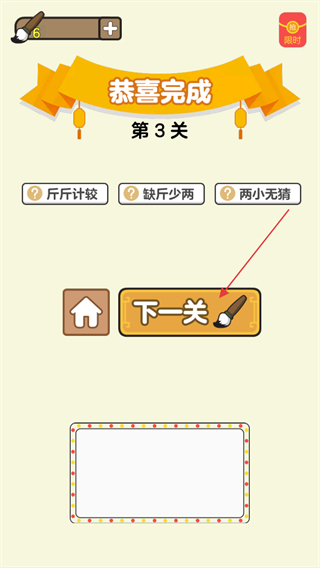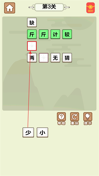 1、查看第3关界面,取下方计填入空格,组成斤斤计较。