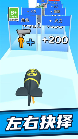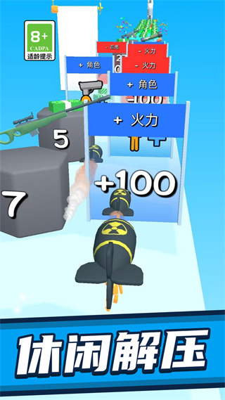 2、操控武器触碰关卡中的增益道具,获取火力及距离加成,避开减益类道具。