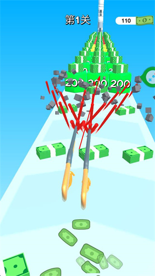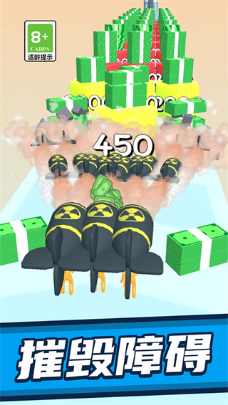 3、利用提升后的火力攻击前方的目标物,击碎障碍并收集散落的金币资源。
