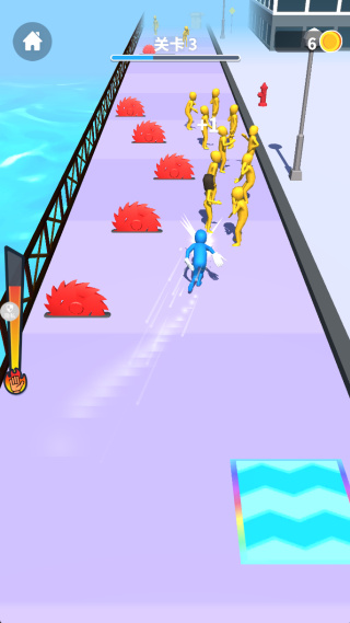 2、移动过程中接触黄色角色,触发互动效果,持续推进角色在赛道上的行进进度。