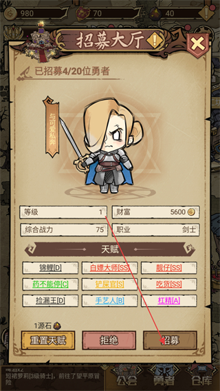4、在招募大厅中,查看勇者信息,点击招募按钮,即可招募该勇者,完成对应任务。