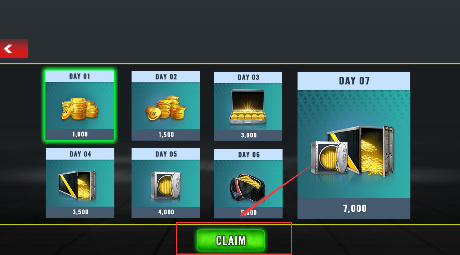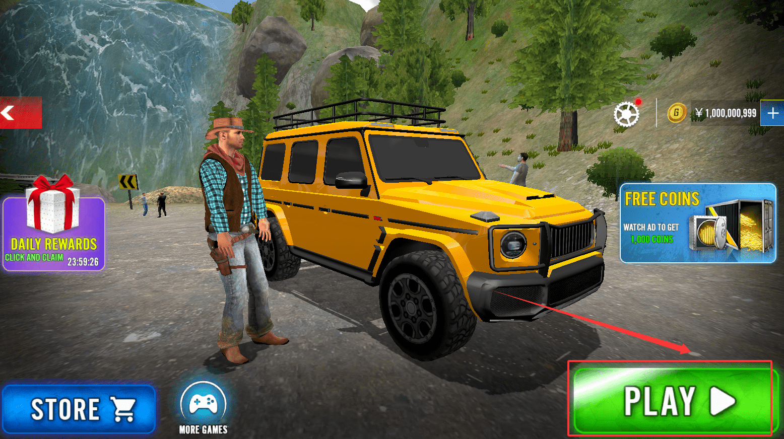 1、进入游戏后点击播放按钮进入主界面选择车辆,无限金币允许随意购买新车并点击选择确认。跳过开场情节直接开始驾驶越野车。