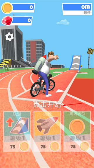 1、点击界面显示的点击开始按钮,启动游戏,控制搭载火箭的单车在跑道移动。