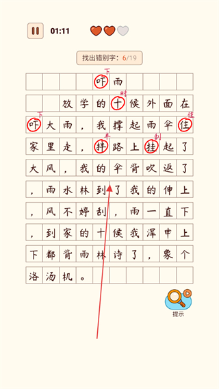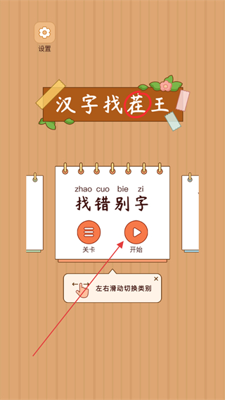 1、点击关卡按钮,进入汉字找错别字的游戏关卡,准备开始挑战。