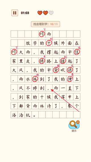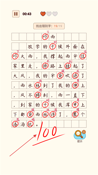 4、找出所有19个错别字后,完成关卡挑战,获得满分通关。