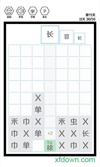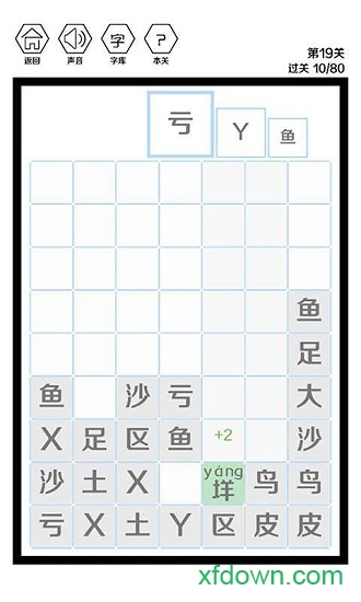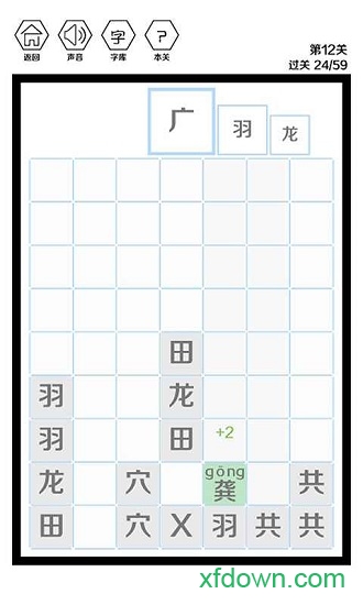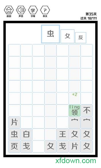 1、首先打开游戏,你会看到第一关的界面,上方有返回、声音、字库等按钮,中间是当前进度“过关0/20”。