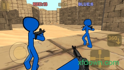 3、遭遇敌方蓝色火柴人时迅速使用右侧射击按键开火,长按可进行连续射击压制对手,注意弹药数量并及时更换弹匣,合理运用跳跃动作还能避开迎面飞来的子弹。