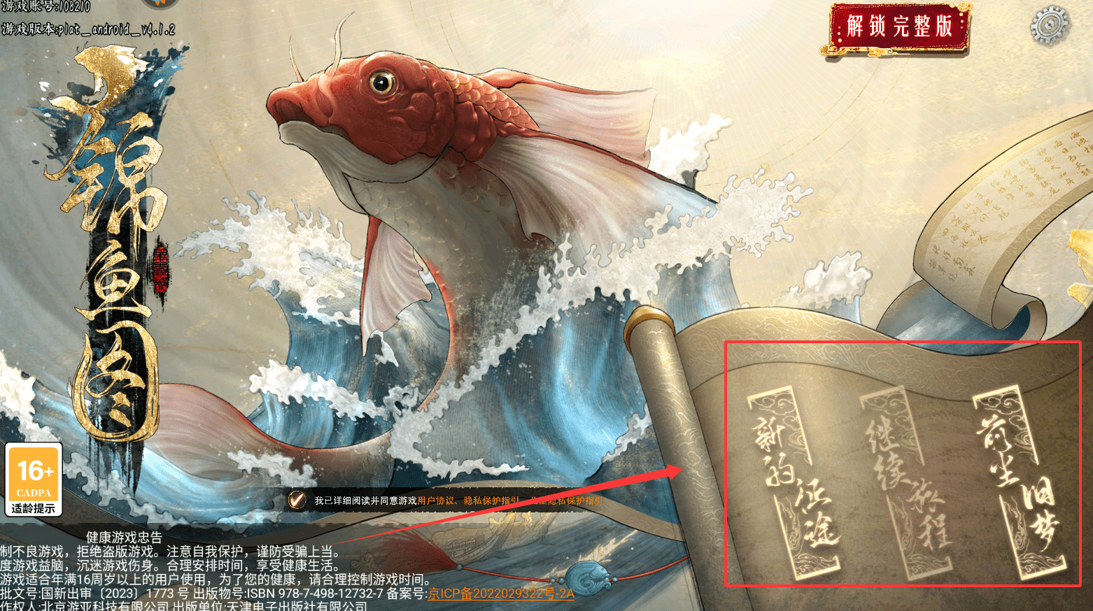 欢迎体验《锦鱼图》第壹部,您可以免费试玩第一章节的部分内容,并可前往主界面"解锁完整版”一次性解锁完整内容。