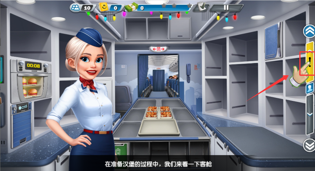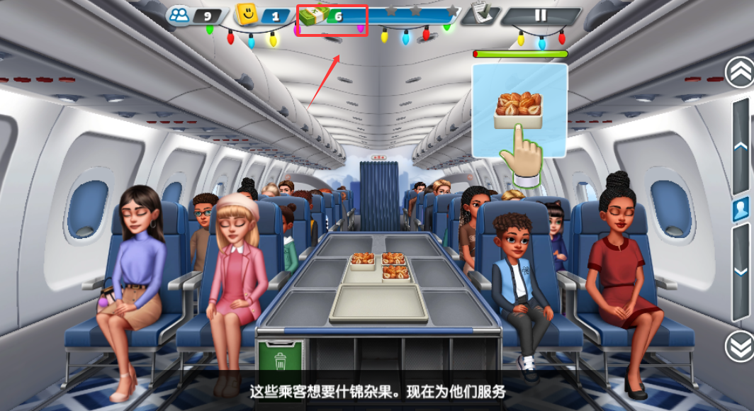 2、完成备餐后需立刻进入客舱提供服务,观察乘客头顶显示的食物需求图案,通过滑动屏幕将对应餐点准确递送,并优先处理像汉堡这样需要保持温度的主食。