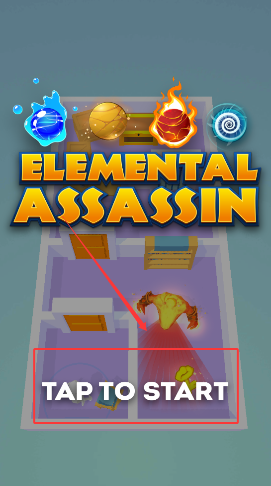 1、首先在游戏开始界面会看到ELEMENTAL ASSASSIN的标题,下方有TAP TO START提示,直接点击屏幕任意位置即可进入游戏。