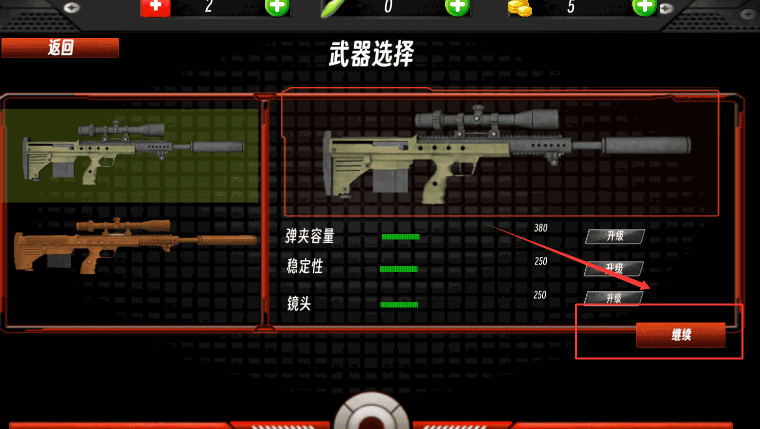 4、选择好武器后,点击右下角的“继续”按钮就能进入下一步,如果选错了也可以点左上角的“返回”重新调整。
