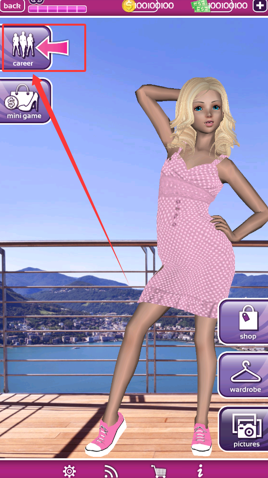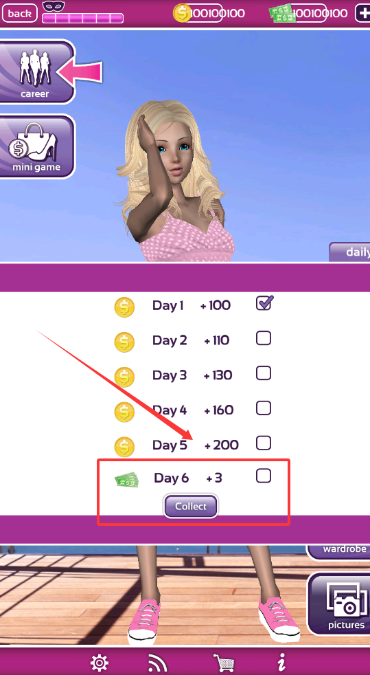 1、进入主界面后,你会看到“career”、“mini game”、“daily”、“wardrobe”、“pictures”等主要模块,可以点击“daily”进入每日任务。