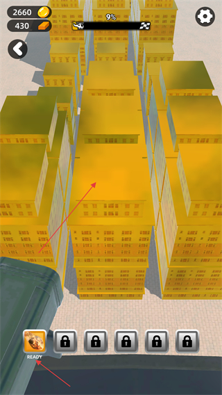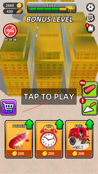 1、点击TAPTOPLAY进入LEVEL5的奖励关卡,可消耗金币升级POWER等属性,提升拆除效率。