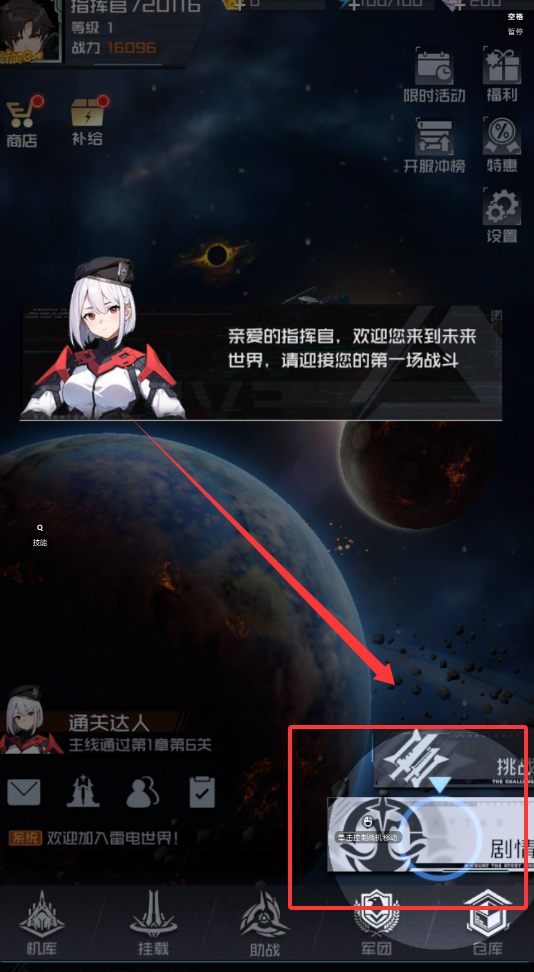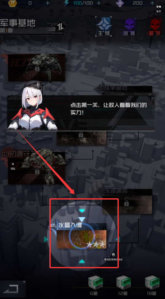 2、接下来,你需要跟随新手引导进行第一场战斗。在主界面或任务中,找到类似“军事基地”的章节,点击“第1关”开始。