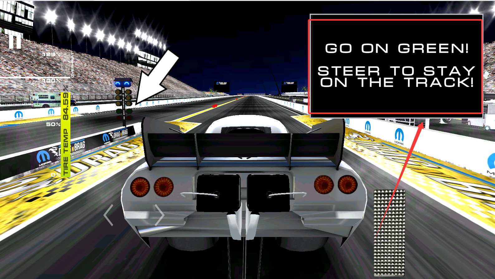 2、接着准备比赛,在“GO ON GREEN”环节绿灯亮起时出发,你需要集中注意力,通过左右滑动来操控车辆,核心目标就是让赛车始终保持在赛道线上,别开出去了。