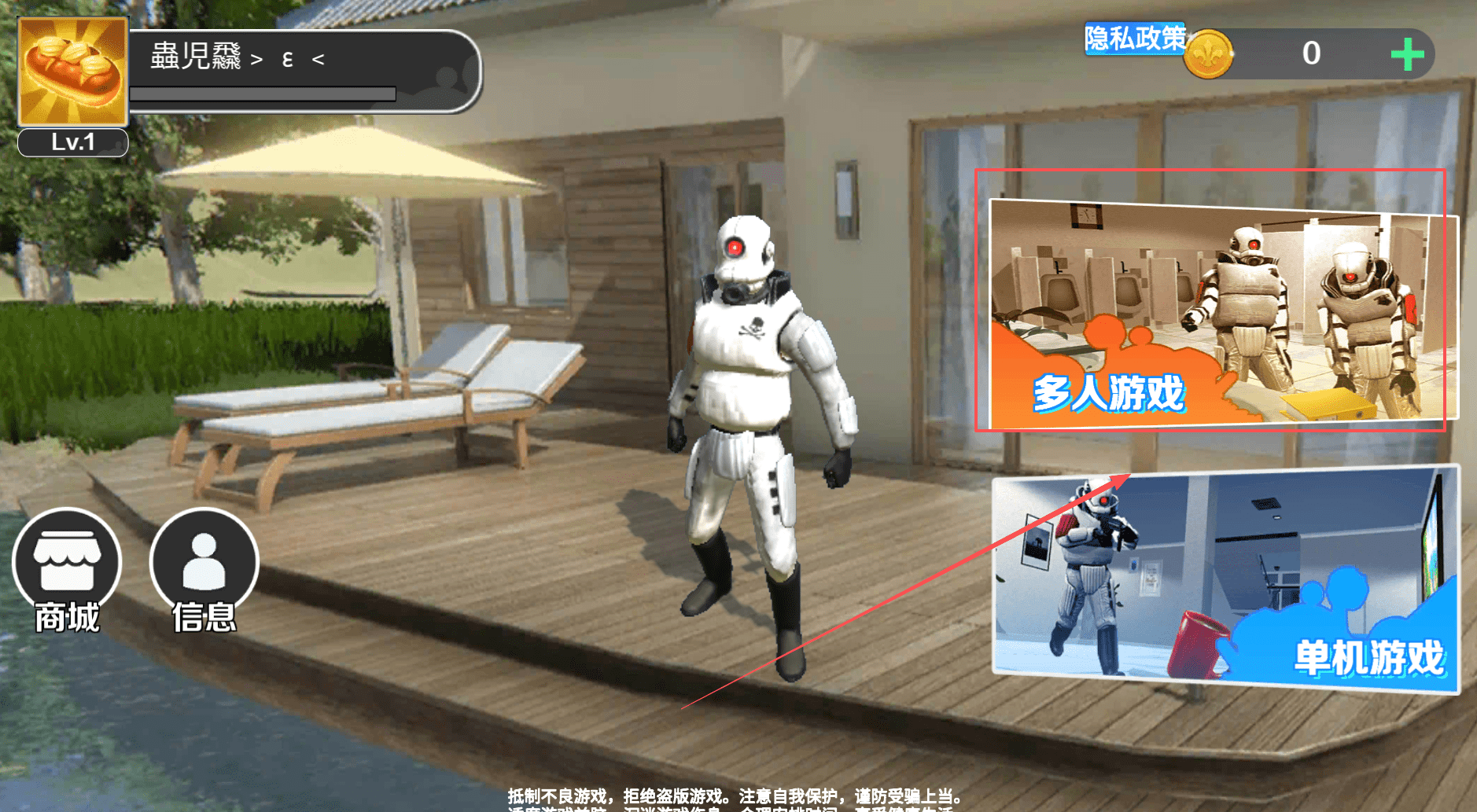 1、首先呢,你可以在主界面看到自己的角色信息,比如名字“蟲児纔”和等级。别着急点“多人游戏”。