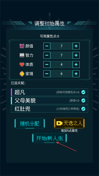 3、在初始属性界面,确认已选天赋对应的属性加成,点击开始新人生开启本次人生模拟。