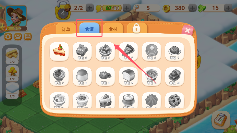 3、在“食谱”系统中,你可以查看所有已解锁的食物制作方法。制作食物不仅是为了完成订单,也是农场收入的重要来源。高级食物售价更高,但需要的食材也更珍贵。
