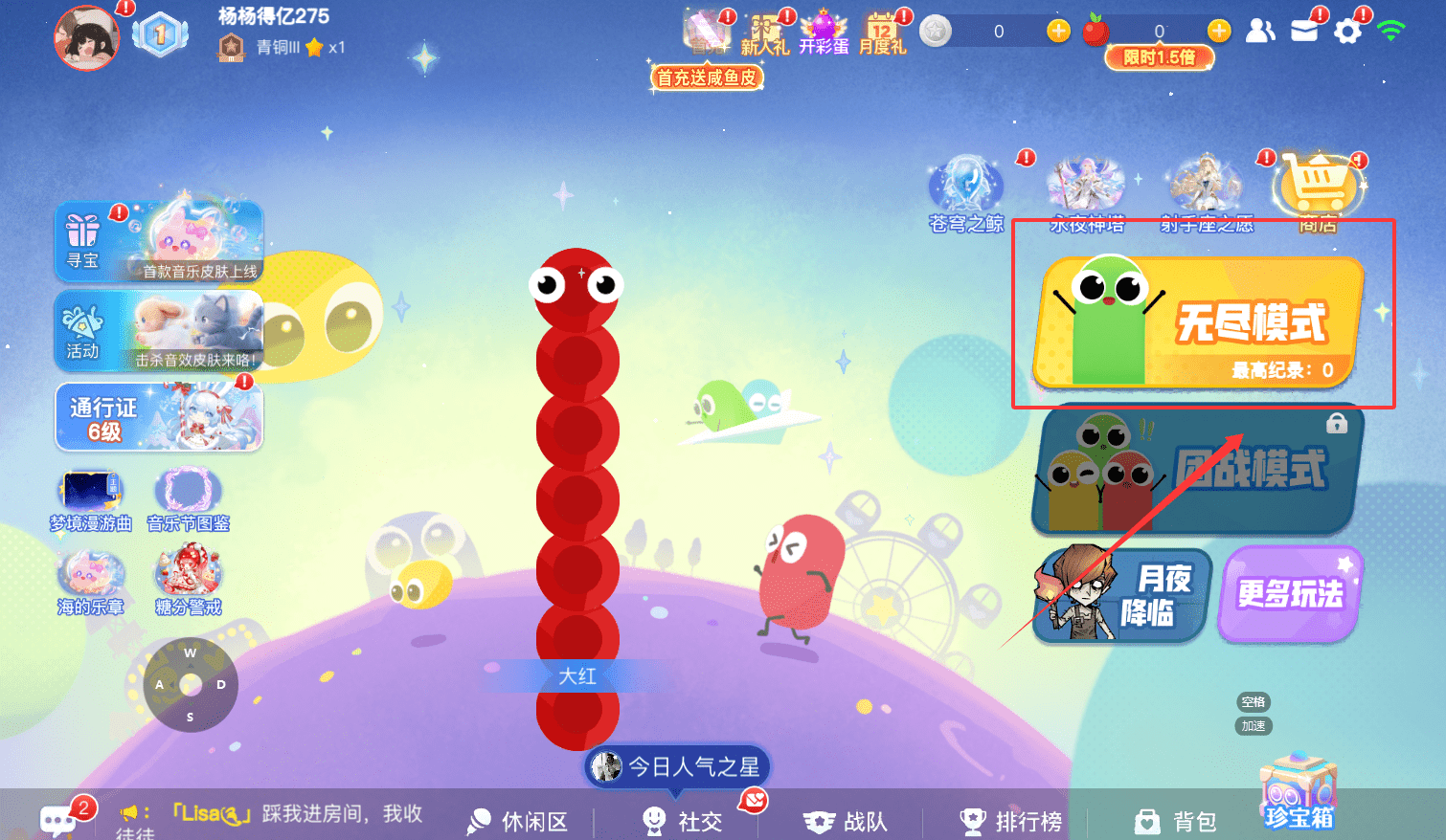 4、除了基础玩法,游戏里还有丰富的社交和奖励系统,比如可以查看“排行榜”,加入“战队”,或者开启“珍宝箱”获取奖励。