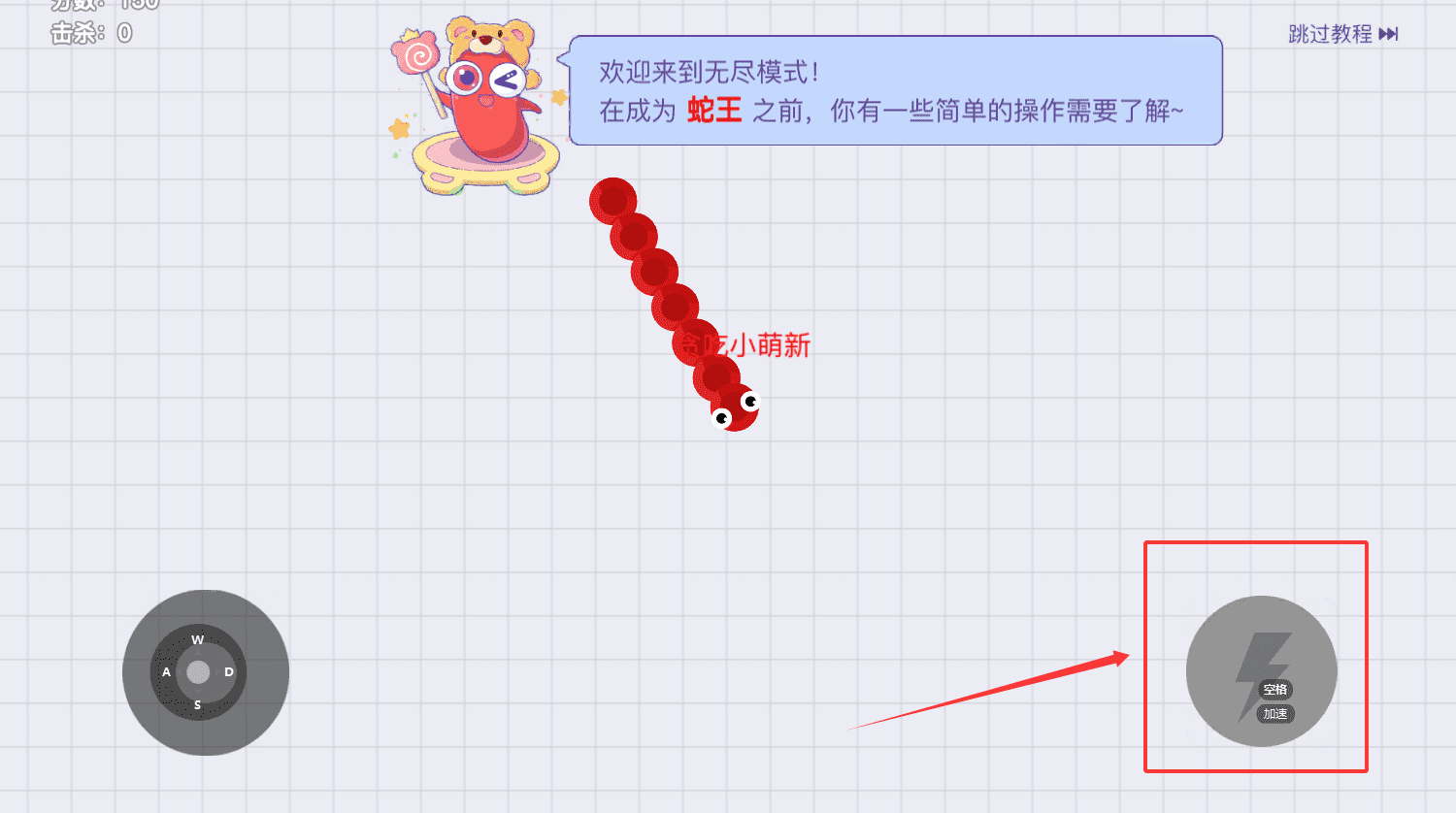 1、首先呢,进入游戏会看到“无尽模式”的欢迎提示,你可以选择“跳过教程”,直接以“无小萌新”的身份开始游戏。