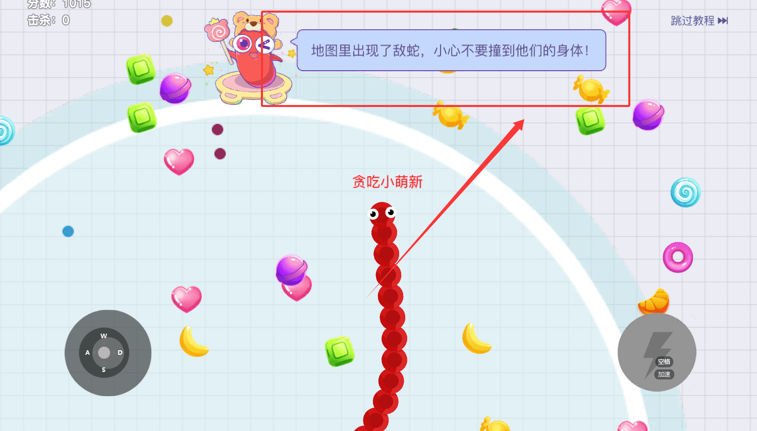 4.长按加速键,用巧妙的走位让蛇身被别人撞上,就可以吃掉他们啦。