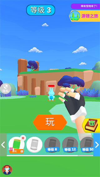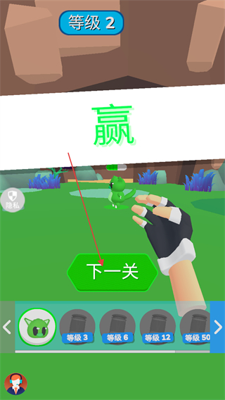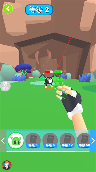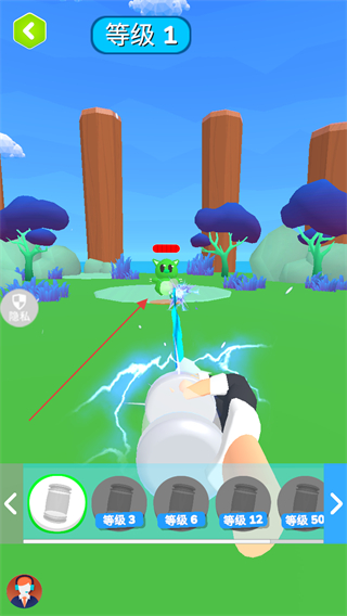 1、在等级1关卡,操控角色攻击绿色宠物,积累等级进度推进游戏。