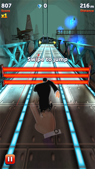 2、在跑酷中按提示滑动屏幕跳跃,躲避红色激光等障碍,积累分数与距离。