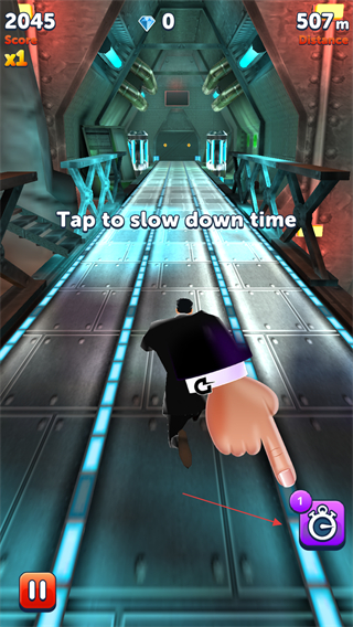 3、遇到密集障碍时,点击右侧的时间减速按钮,降低节奏以便更轻松躲避危险。