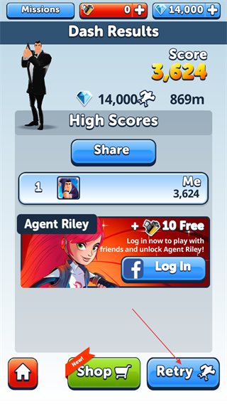 4、结算界面点击Retry重新开始跑酷,重复挑战提升分数与距离记录。