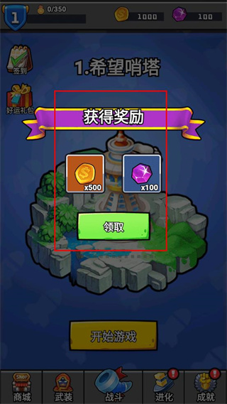 4、关卡战斗完成后,界面会弹出获得奖励提示,点击领取按钮获取对应的金币和钻石奖励。