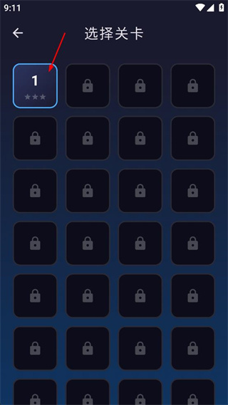 1、点击游戏主界面中的开始游戏按钮,进入选择关卡页面,选择已解锁的第1关。