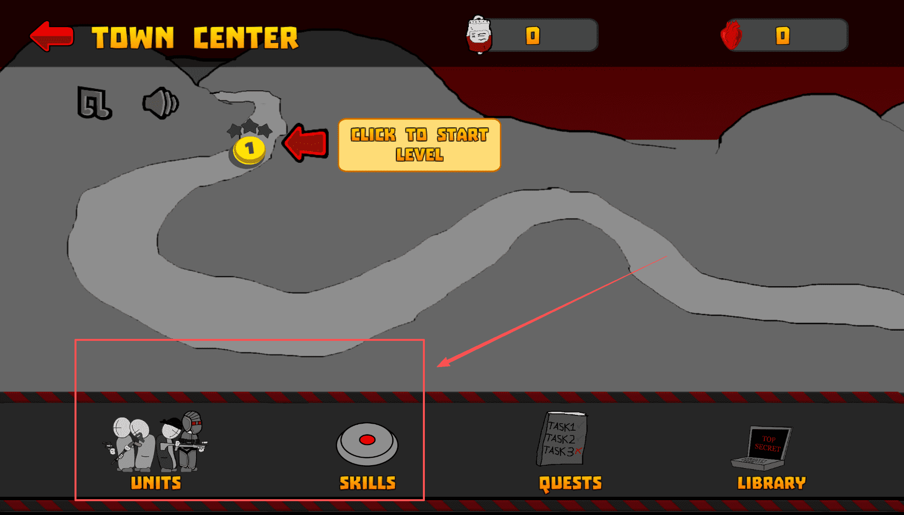 4、完成关卡或需要回顾时,你可以返回城镇中心。在那里,你可以通过“单位”和“技能”菜单升级你的能力。