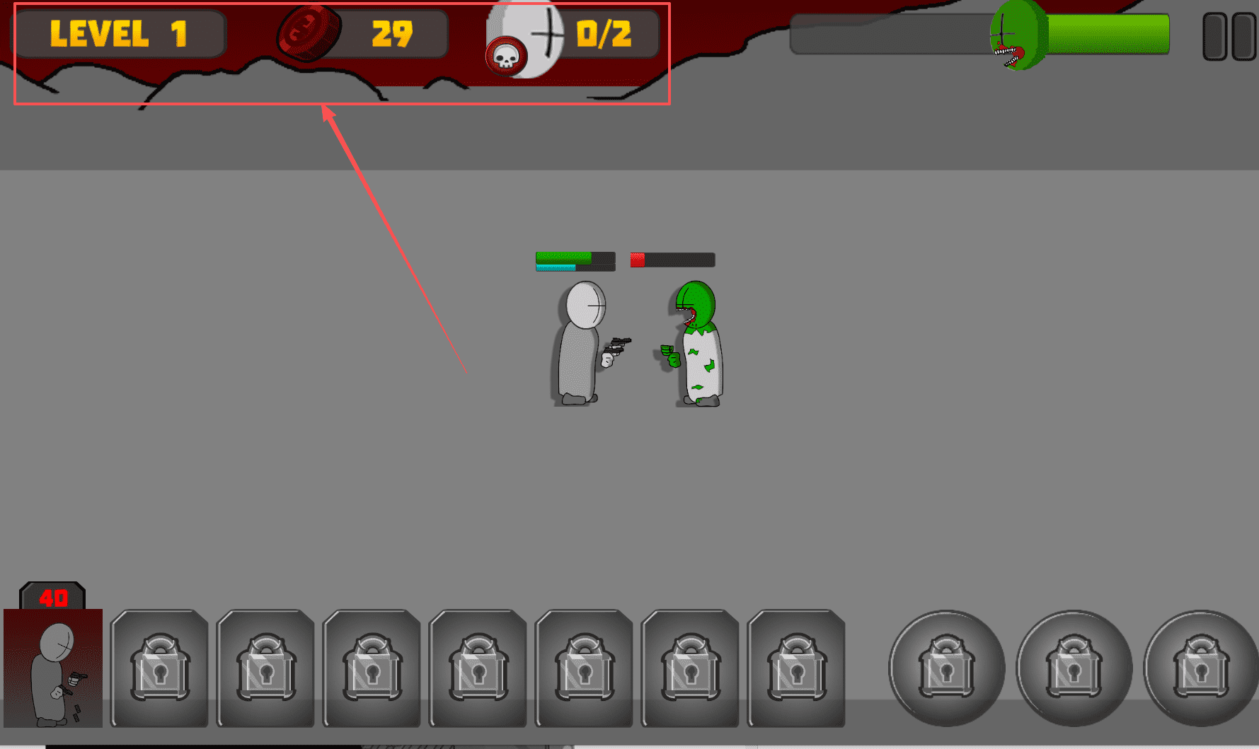 2、进入关卡后,注意看屏幕上方的信息栏,那里会显示当前的关卡等级和波次,例如“等级1 29 D/Z”。