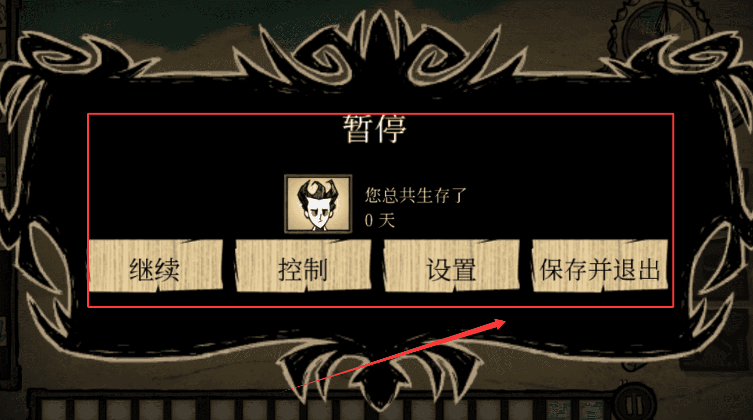 2、进入游戏后,你会看到生存天数统计,初始是0天,如果想暂停游戏,可以点击“暂停”按钮,在暂停菜单里。